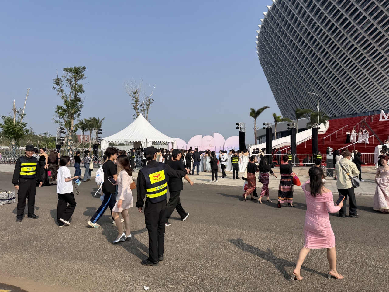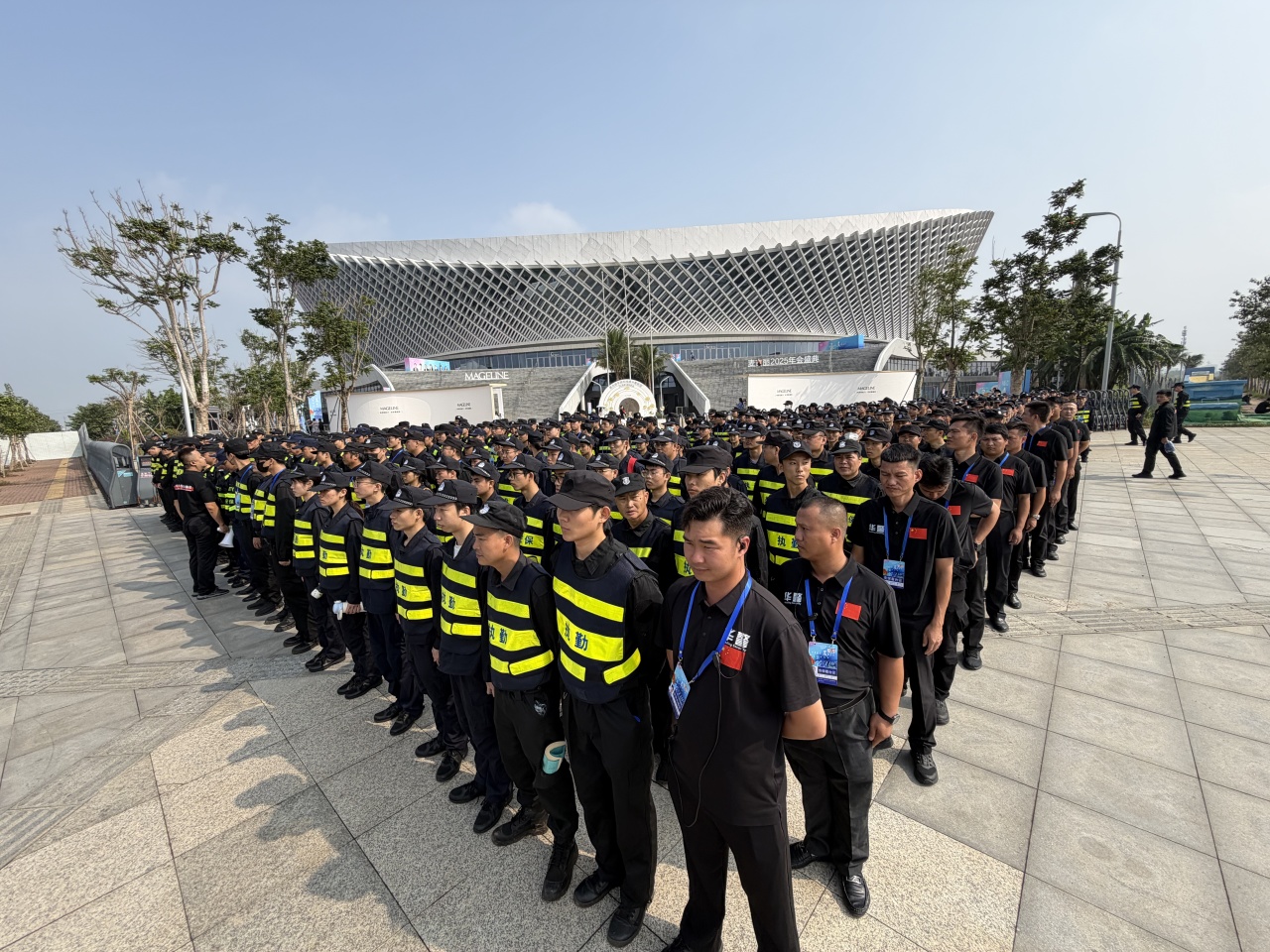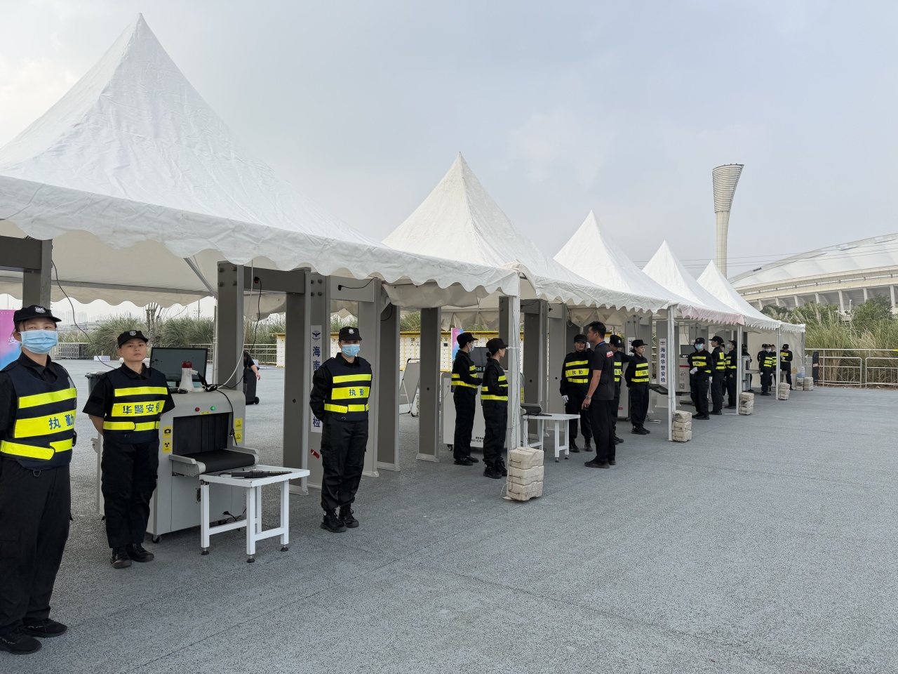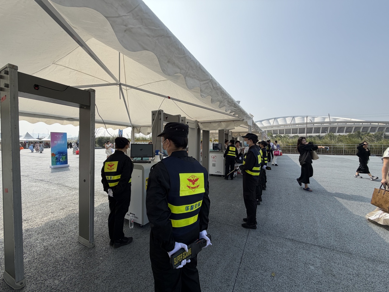 活动期间,海南华警安全服务集团采用智能化管理系统,部署人像识别和车辆验证终端,实现“零接触”快速通行,显著提升安检效率与安全性。保安人员在会场入口、重要通道、后台以及重要区域进行巡逻和监控,以确保与会人员的安全。同时把保安人员与会场内的其他工作人员和参会嘉宾进行良好的沟通与配合作为第一要素。 设立安检通道,对与会人员进行随身物品的安全检查,以防止携带危险物品进入会场。